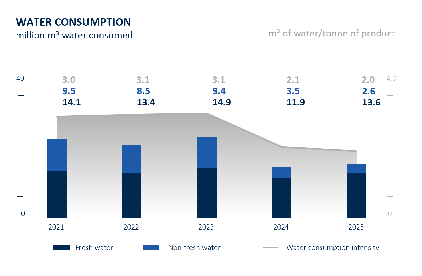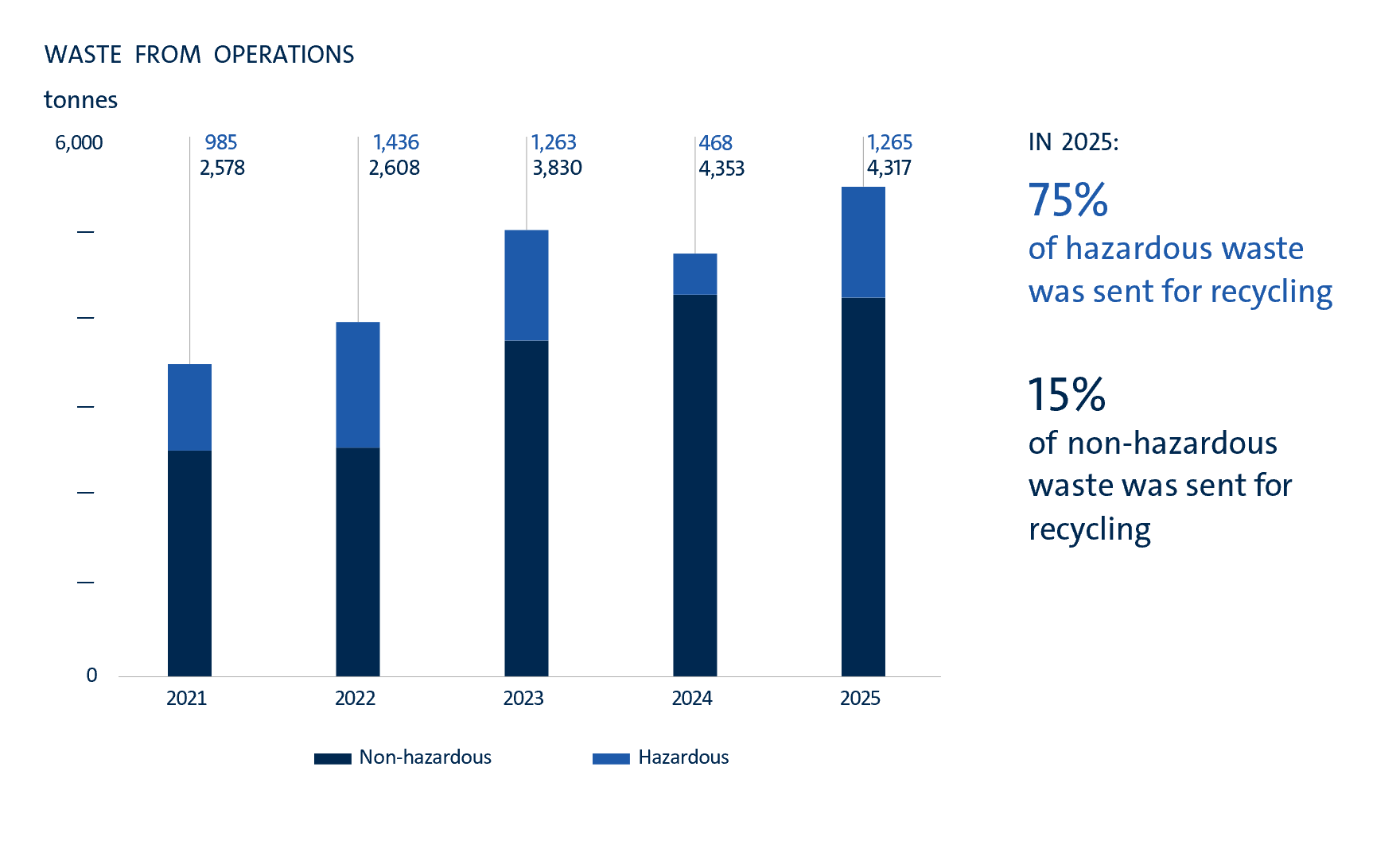 Water stewardship and wasteWe focus on efficient water use, reuse, and recycling, particularly at freshwater‑dependent sites. Waste generation during normal operations is low, with most waste arising during maintenance turnarounds and managed through strict segregation, recycling, and safe disposal practices. |