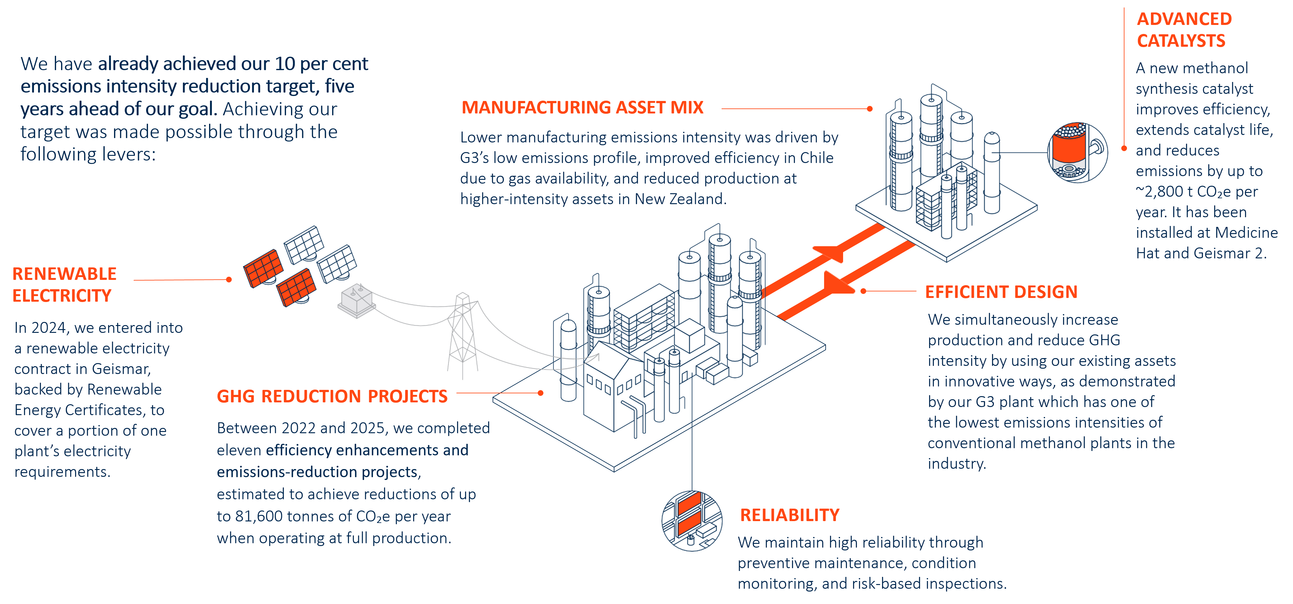 In 2025, we reduced our operational emissions through: achieving full production from our G3 plant, which has one of the lowest emissions intensities of conventional methanol plants in the industry; our manufacturing asst mix; a focus on improving plant reliability; and emissions reduction projects.