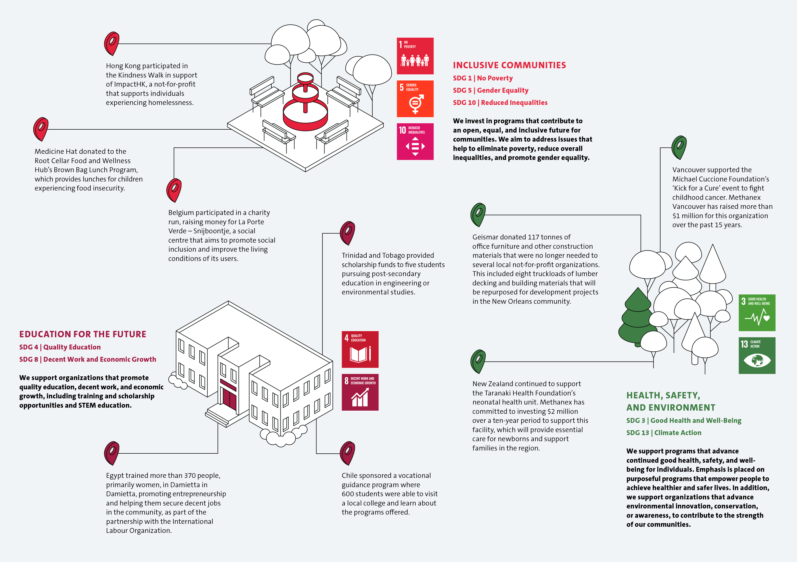 We strive to be a respected and valued corporate citizen by creating positive and long-term impacts in the communities where we operate. Our Community Investment Program focuses our community giving under three pillars tied to seven United Nations Sustainable Development Goals (SDGs) where we believe we can create a positive impact. In 2024, these are some of the initiatives we supported: