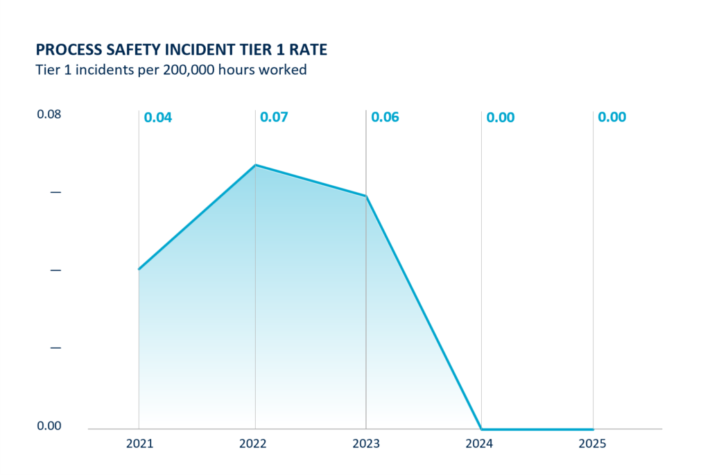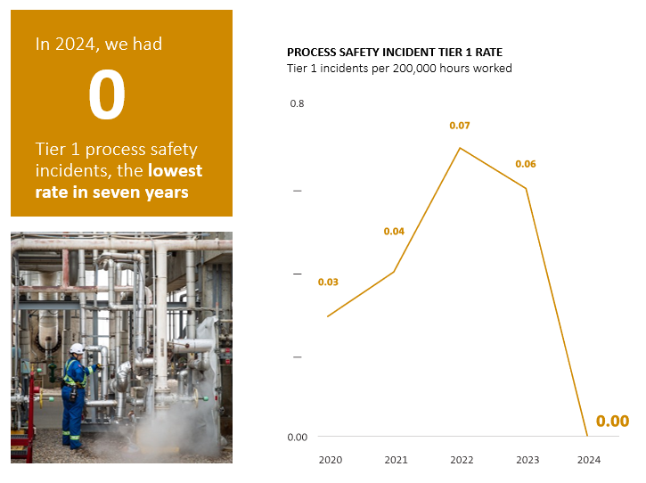 Our focus on hazard prevention and high-quality incident reviews by leadership has helped us maintain a low rate of process safety incidents in the last five years.