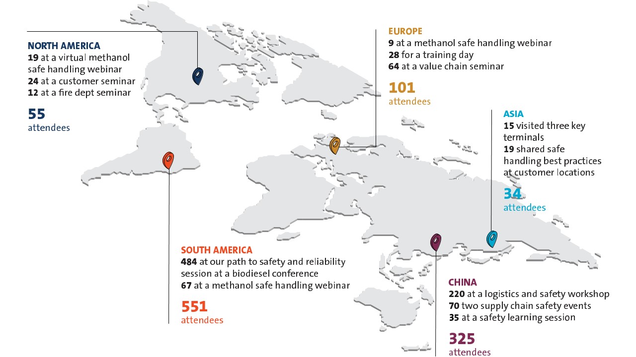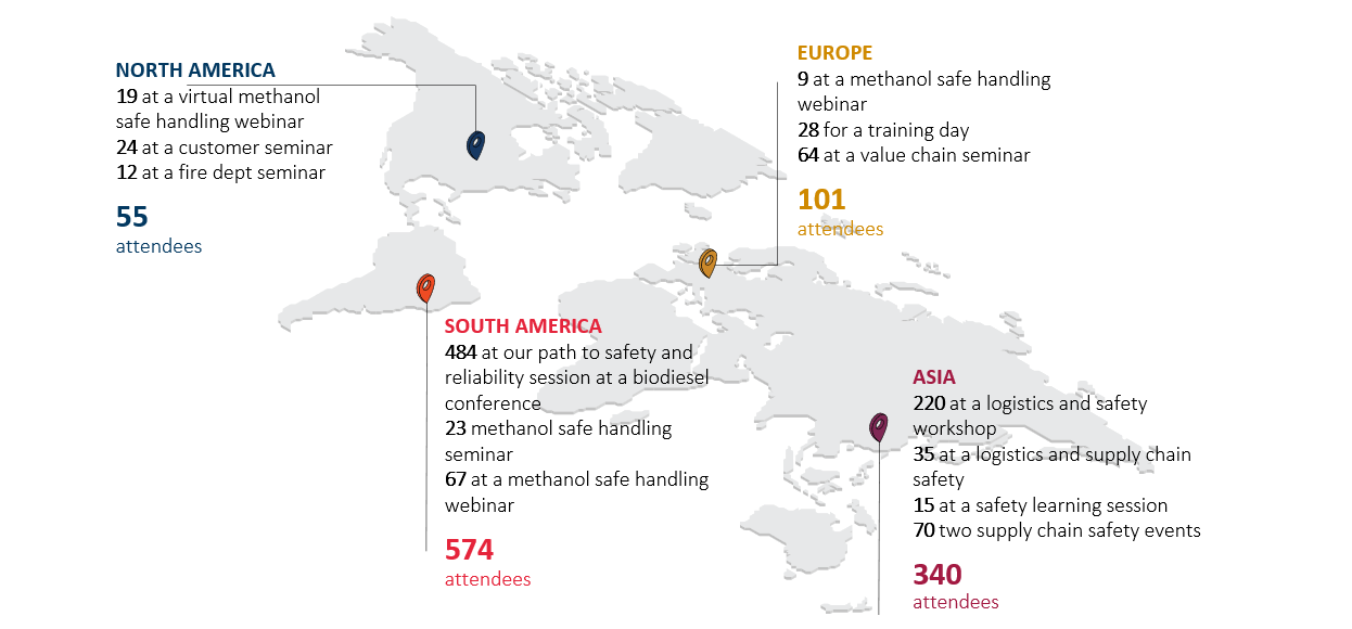 We promote safe handling practices not only in our organization, but externally across the globe. We use our experience to help educate customers, distributors and logistics partners on topics such as safe handling, barge inspections, emergency response drills and training, fire safety, and road safety.